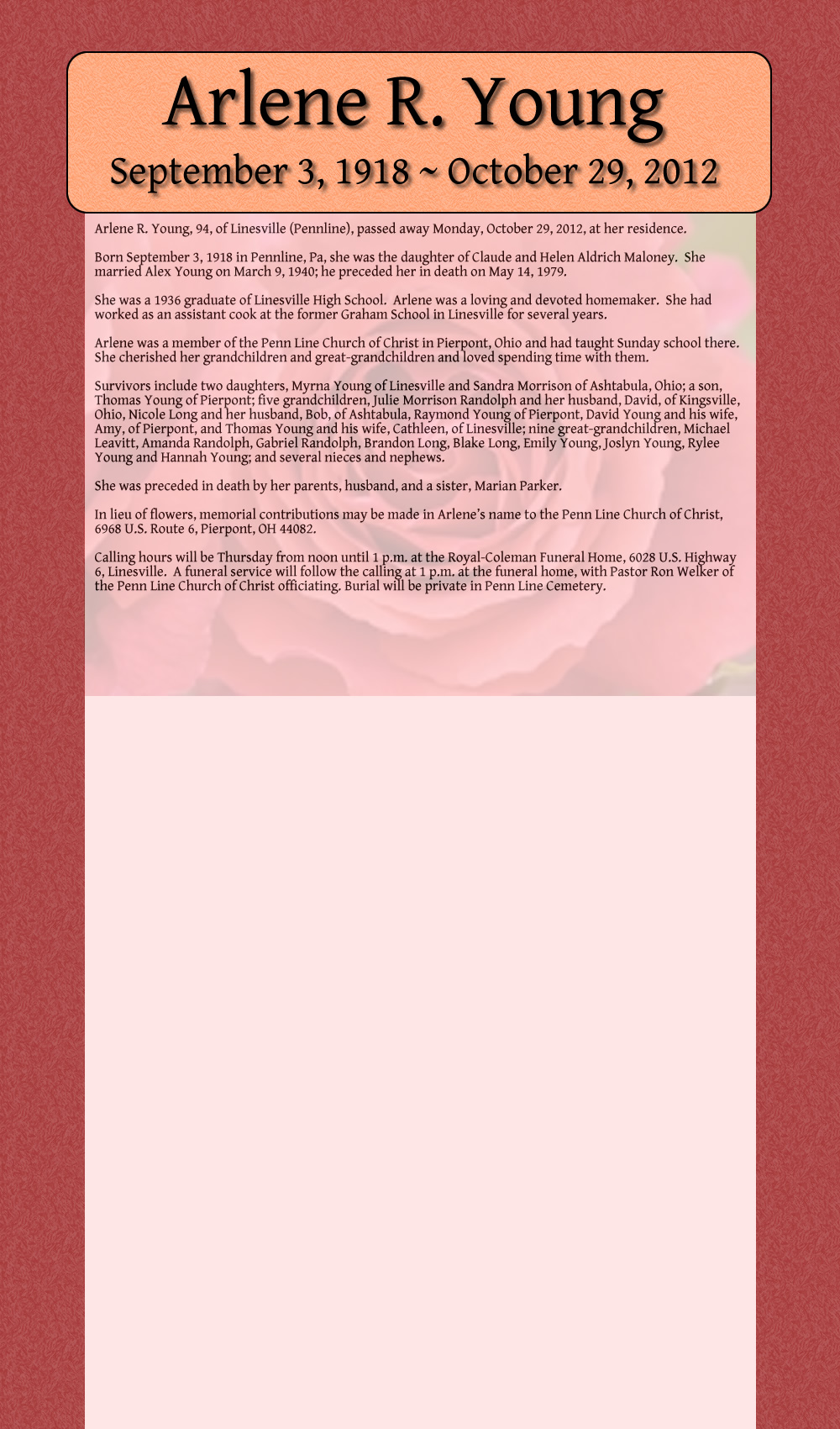Arlene R. Young, 94, of Linesville (Pennline), passed away Monday, October 29, 2012, at her residence.