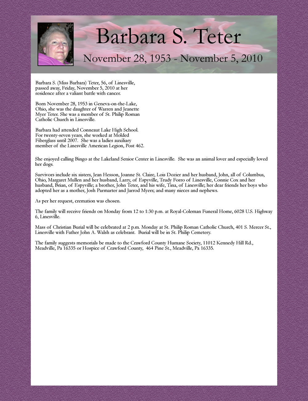 Barbara S, (Miss Barbara) Teter, 56, of Linesville, passed away, Friday, November 5, 2010 at her residence after a valiant battle with cancer.