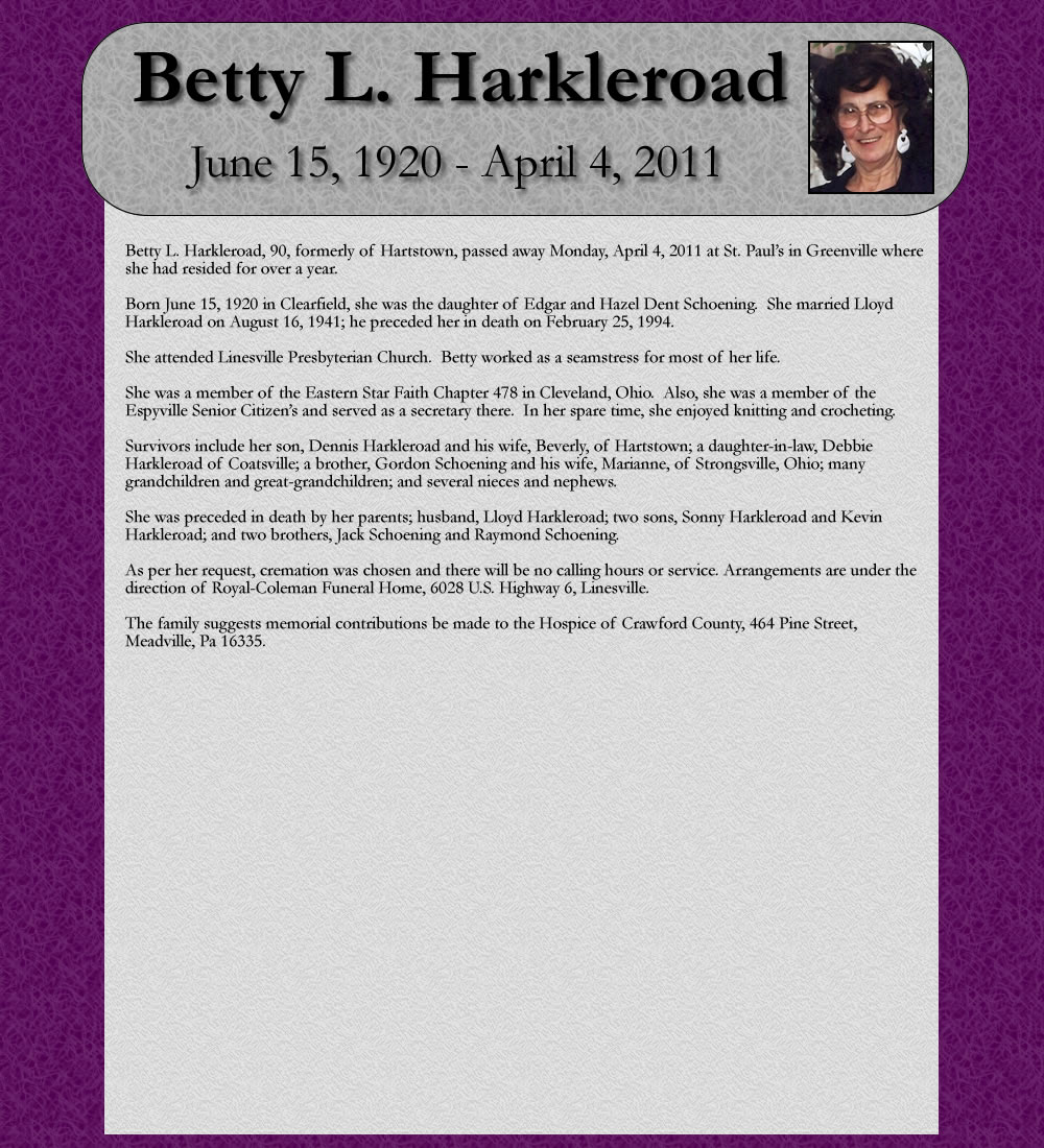Betty L. Harkleroad, 90, formerly of Hartstown, passed away Monday, April 4, 2011 at St. Paul’s in Greenville where she had resided for over a year.