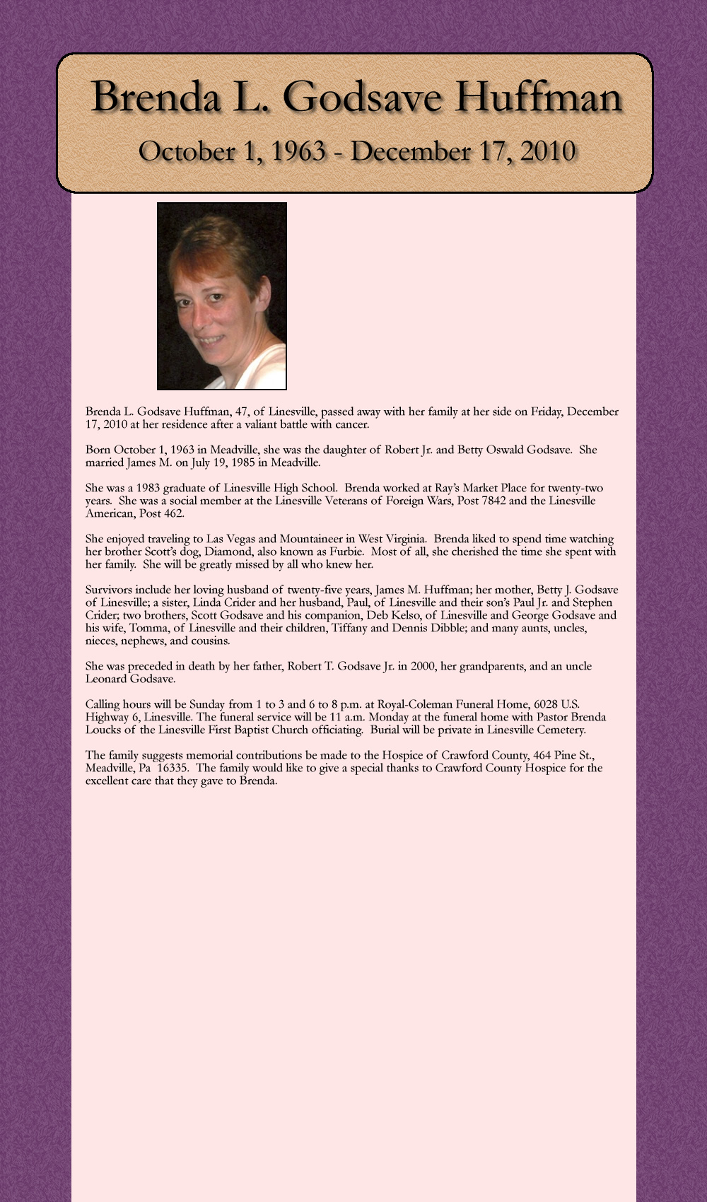 Brenda L. Godsave Huffman, 47, of Linesville, passed away with her family at her side on Friday, December 17, 2010 at her residence after a valiant battle with cancer.