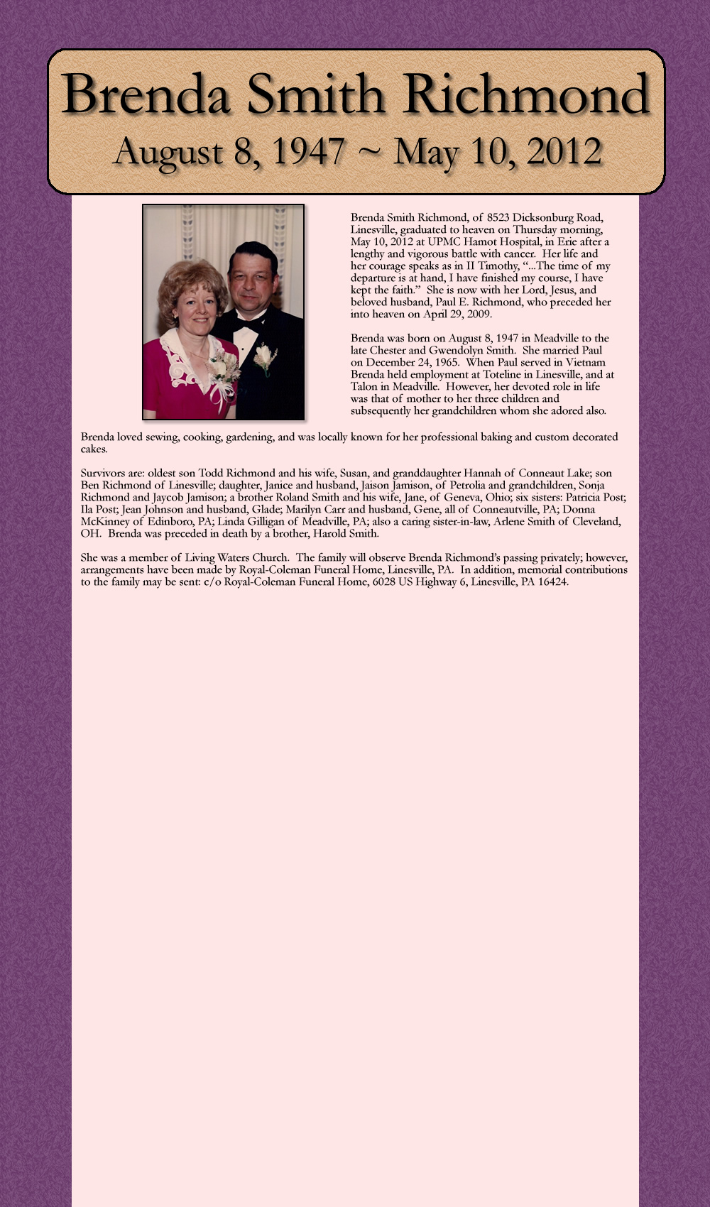 Brenda Smith Richmond, of 8523 Dicksonburg Road, Linesville, graduated to heaven on Thursday morning, May 10, 2012 at UPMC Hamot Hospital, in Erie after a lengthy and vigorous battle with cancer. Her life and hee courage speaks as in II Timothy, “... The time of my departure is at hand, I have finished my cousse, I have kept the faith.” She is now with her Lord, Jesus, and beloved husband, Paul E. Richmond, who preceded her into heaven on April 29, 2009,