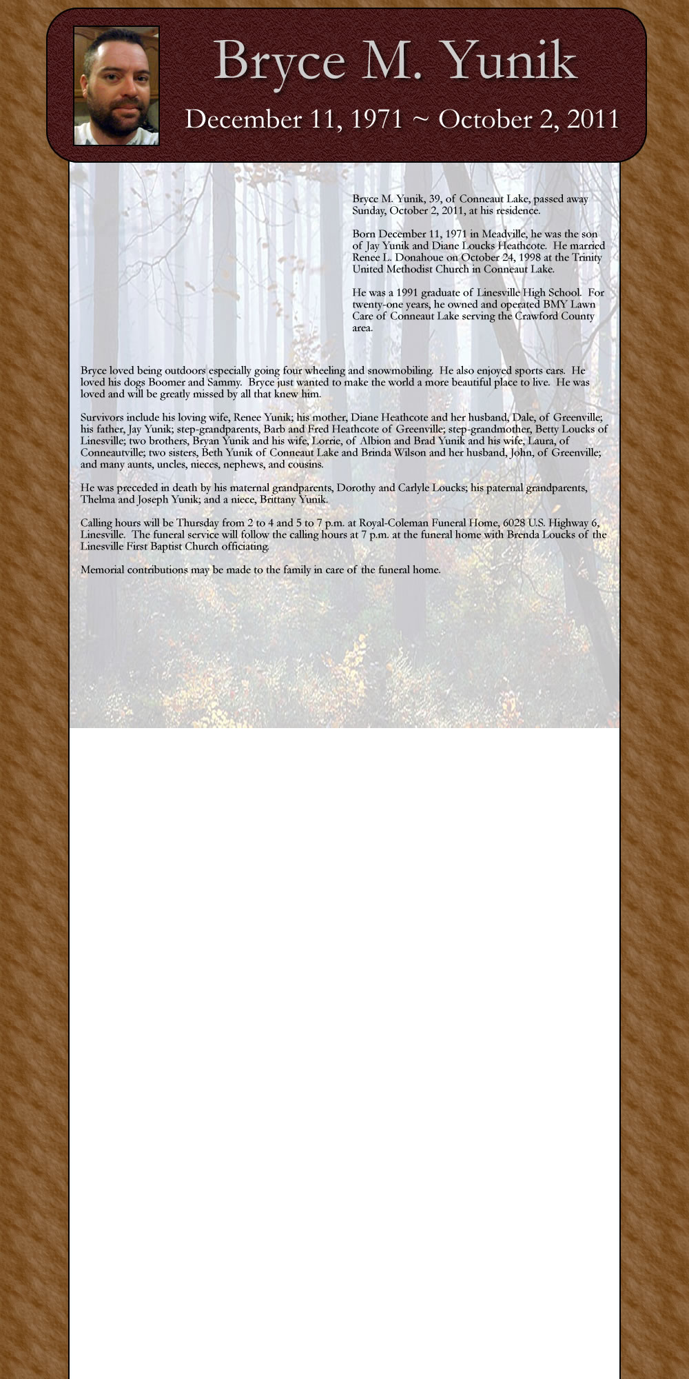 Bryce M. Yunik, 39, of Conneaut Lake, passed away Sunday, October 2, 2011, at his residence