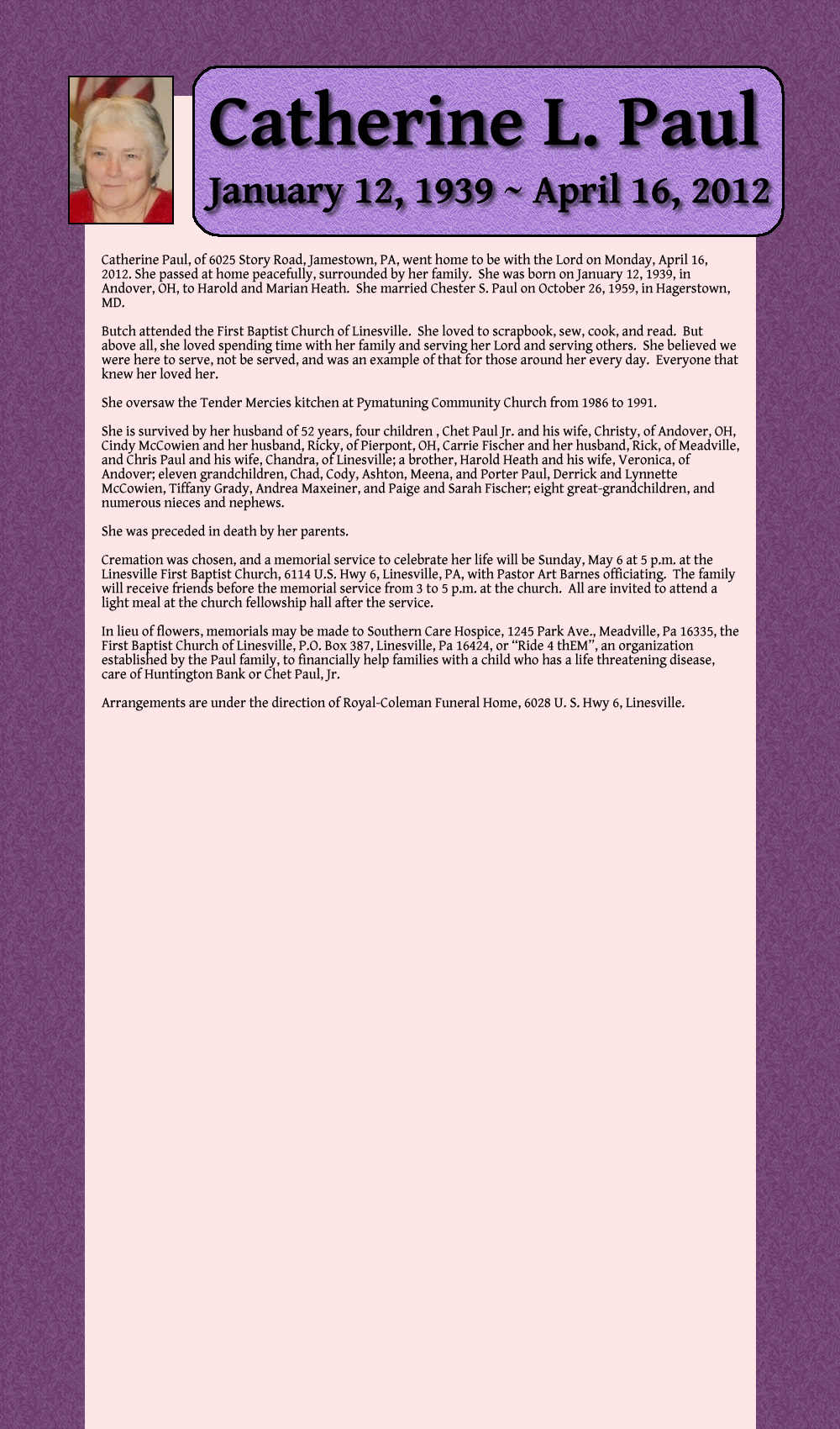 Catherine Paul, of 6025 Story Road, Jamestown, PA, went home to be with the Lord on Monday, April 16, 2012, She passed at home peacefully, surrounded by her family, She was born on January 12, 1939, in Andover, OH, to Harold and Marian Heath. She married Chester S, Paul on October 26, 1959, in Hagerstown, MD.