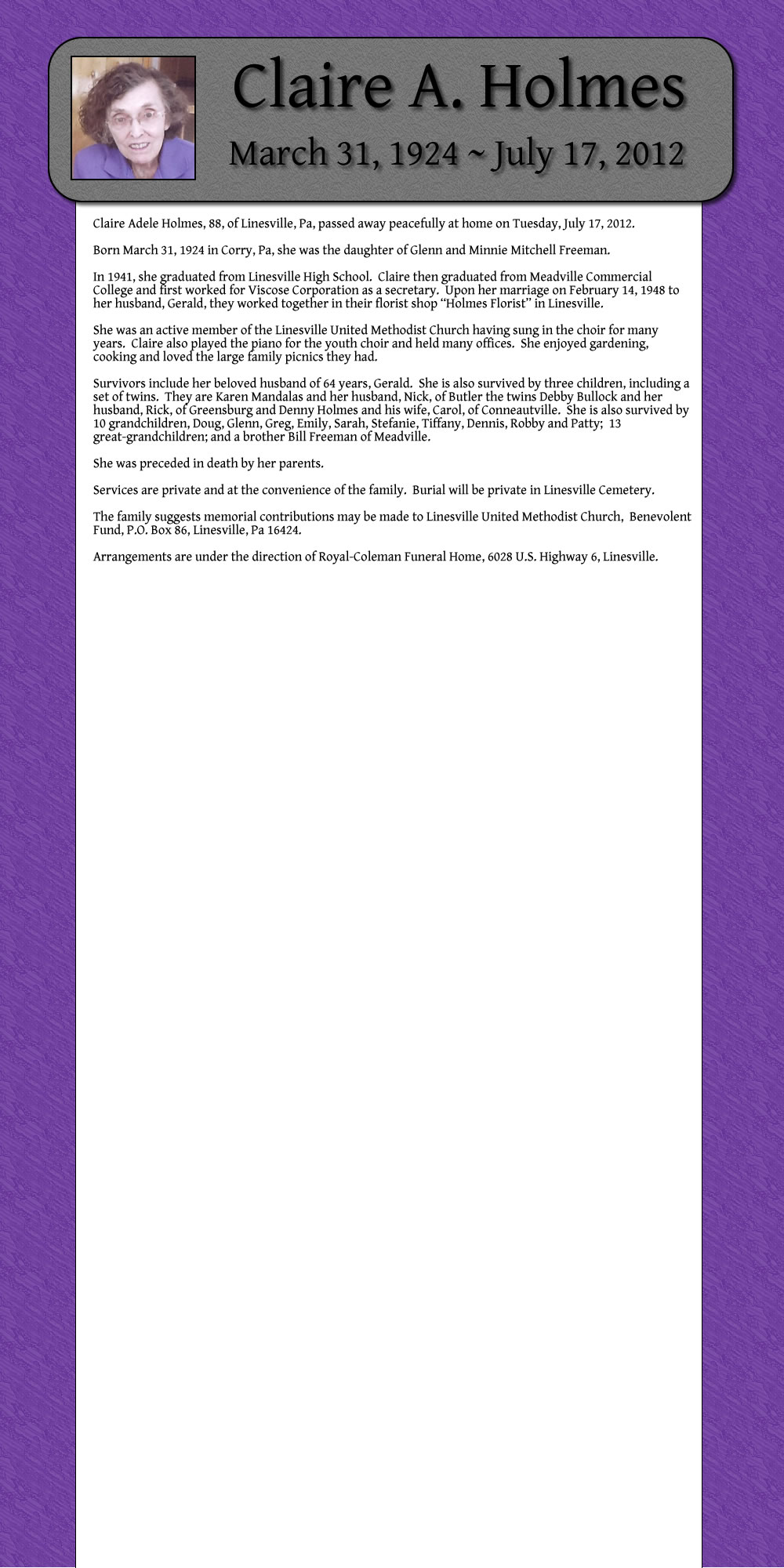 Claire Adele Holmes, 88, of Linesville, Pa, passed away peacefully at home on Tuesday, July 17, 2012.