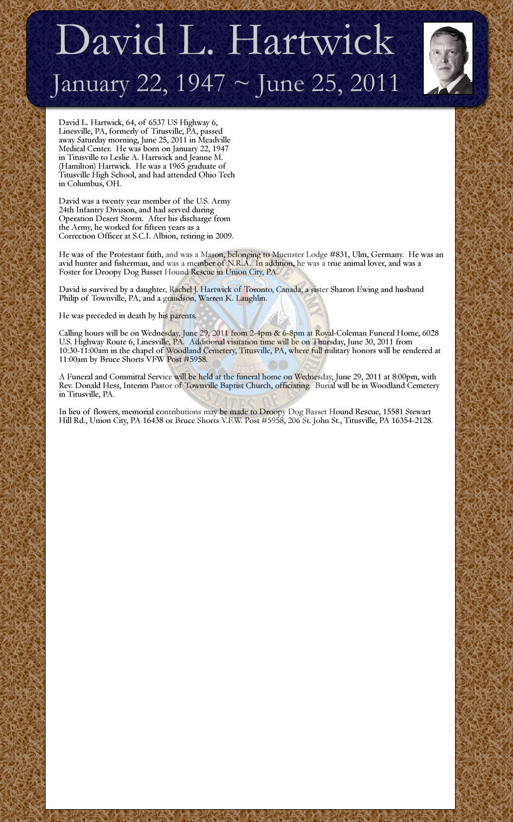 Caling hours wil be on Wednesda, June 29, 2011 from2-4pm & 6-Epm at Royhl-Coleman Funeral Home, 6028 US. Highway Route 6, Linesville, PA, Additional visitation time will be on Thursday, June 30, 2011 from. 10:30-11:00am in the chapel of Woodland Cemetery, Titusville, PA, where full military honors will be rendered at 11:00am by Bruce Shorts VFW Post #5958.