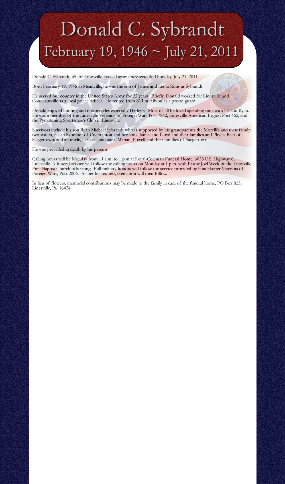 Donald C. Sybrandt, 65, of Linesville, passed away unexpectedly Thursday, July 21, 2011 Bor February 19, 1946 in Meadville, he was the son of James and Lota Ritnour Sybrandt.