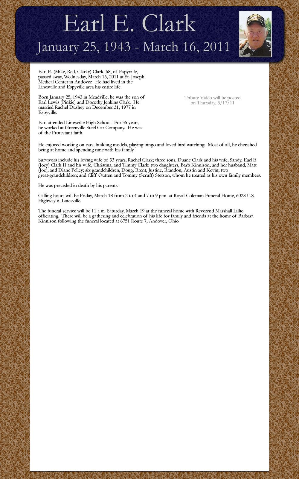 Earl E. (Mike, Red, Clarky) Clark, 68, of Espyville, passed away, Wednesday, March 16, 2011 at St. Joseph, Medical Center in Andover. He had lived in the Linesville and Espyville area his entice life.