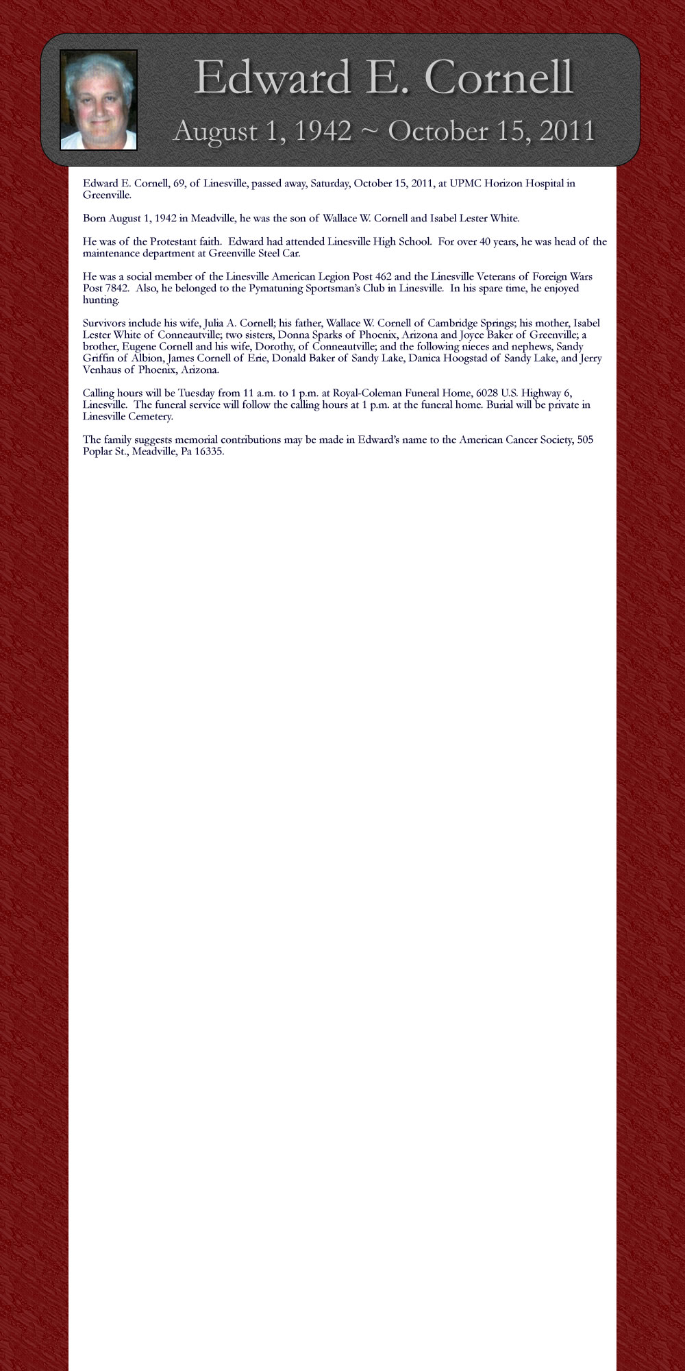ard E. Cornell, 69, of Linesville, passed away, Saturday, October 15, 2011, at UPMC Horizon Hospital in Greenville.