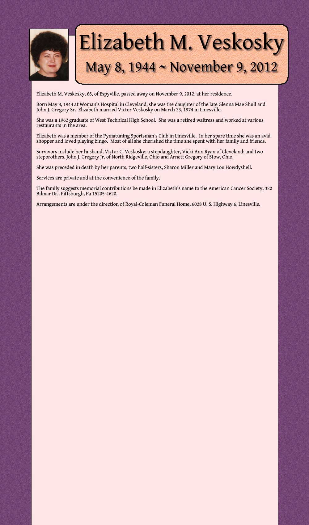 Born May 8, 1944 at Woman's Hospital in Cleveland, she was the daughter of the late Glenna Mae Shull and John J. Gregory Sr, Elizabeth married Victor Veskosky on March 23, 1974 in Linesville.