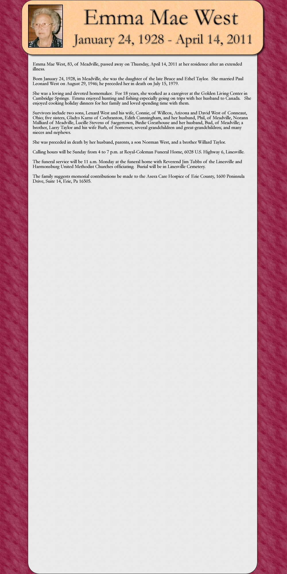 Emma Mae West, 83, of Meadville, passed away on Thursday, Apsil 14, 2011 at her residence after an extended illness.