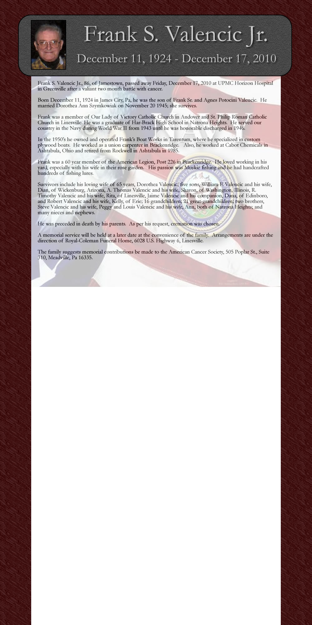 Frank §. Valencic Jr, 86, of Jamestown, passed away Friday, December 17, 2010 at UPMC Horizon Hospital in Greenville after a valiant two month battle with cancer.