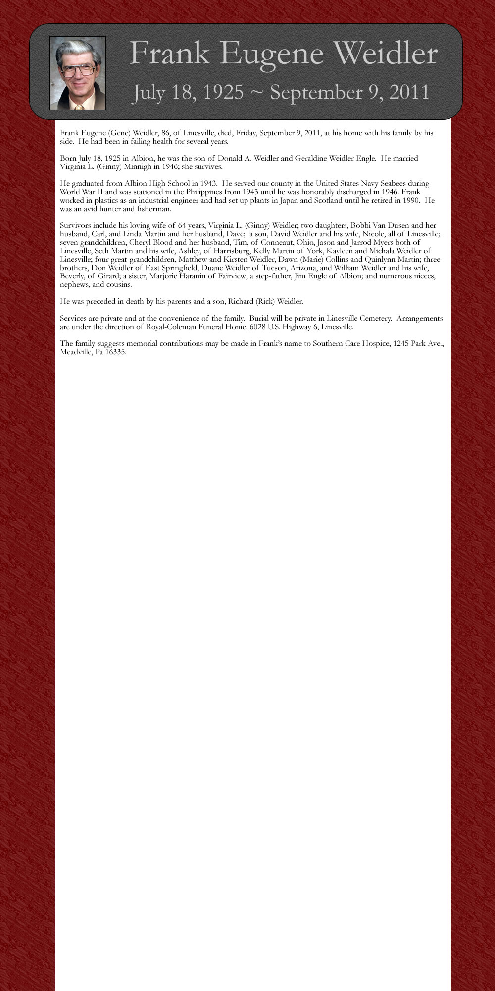 ‘The family suggests memorial contributions may be made in Frank’s name to Southern Care Hospice, 1245 Park Av Meadville, Pa 16335.