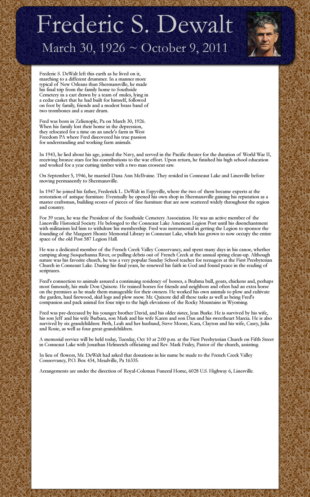 In 1947 he joined his father, Frederick L. DeWalt in Espyville, where the two of them became experts at the restoration of antique furniture. Eventually he opened his own shop in Shermanswille gaining his reputation as a master craftsman, building scores of pieces of fine fusnituse that are now scattered widely thoughout the region and country.