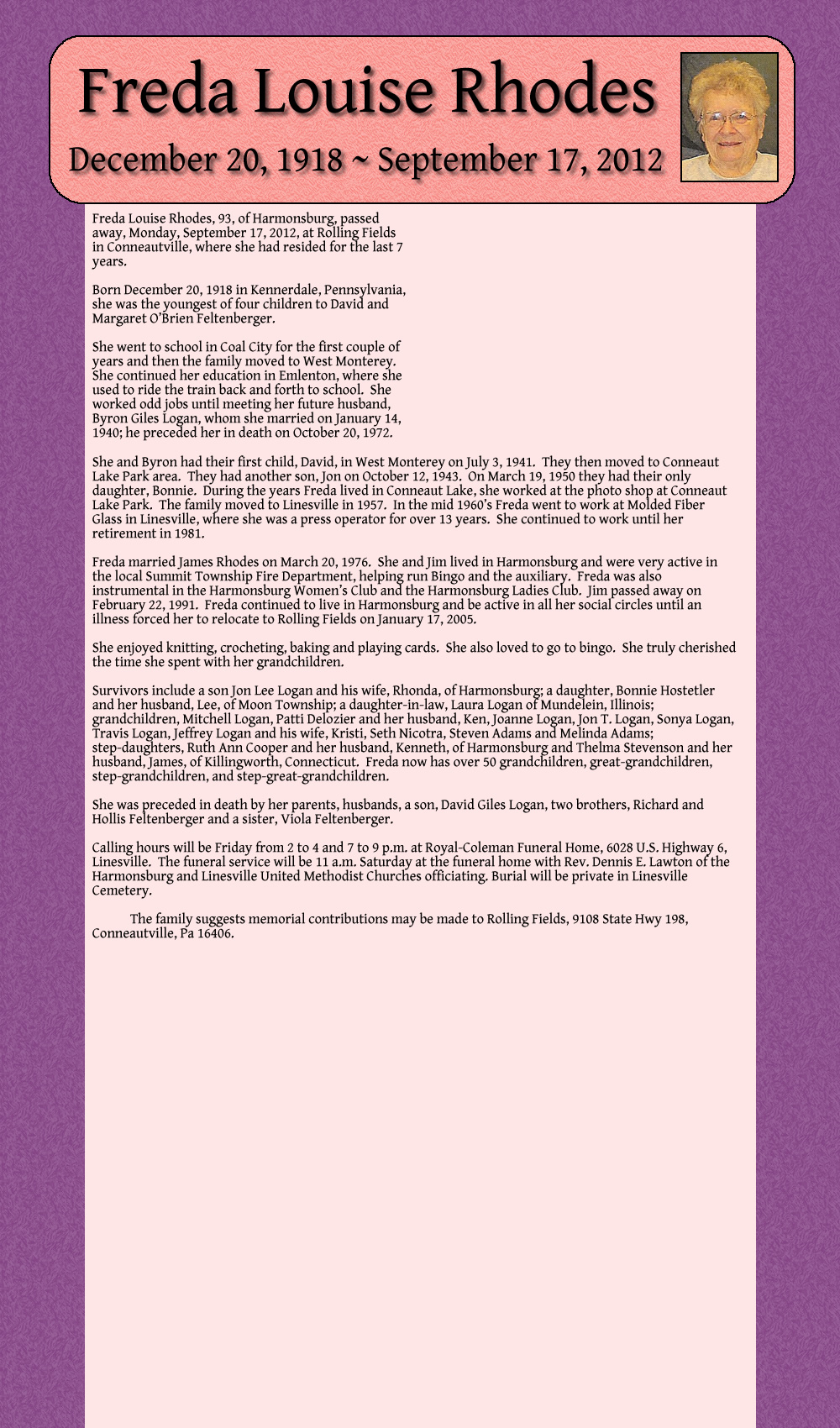 Freda Louise Rhodes, 93, of Harmonsburg, passed away, Monday, September 17, 2012, at Rolling Fields in Conneautville, where she had resided for the last 7 years.