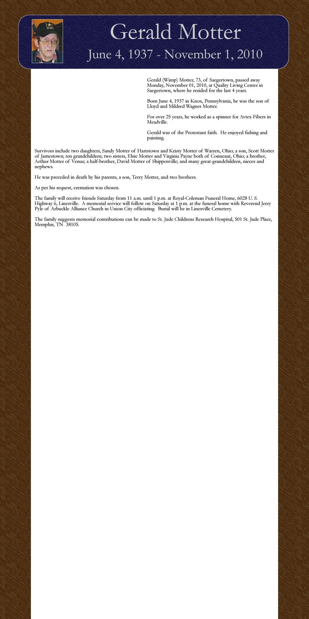 Gerald (Wimp) Motter, 73, of Saegertown, passed away Monday, November 01, 2010, at Quality Living Center in Saegertown, where he resided for the last 4 years.