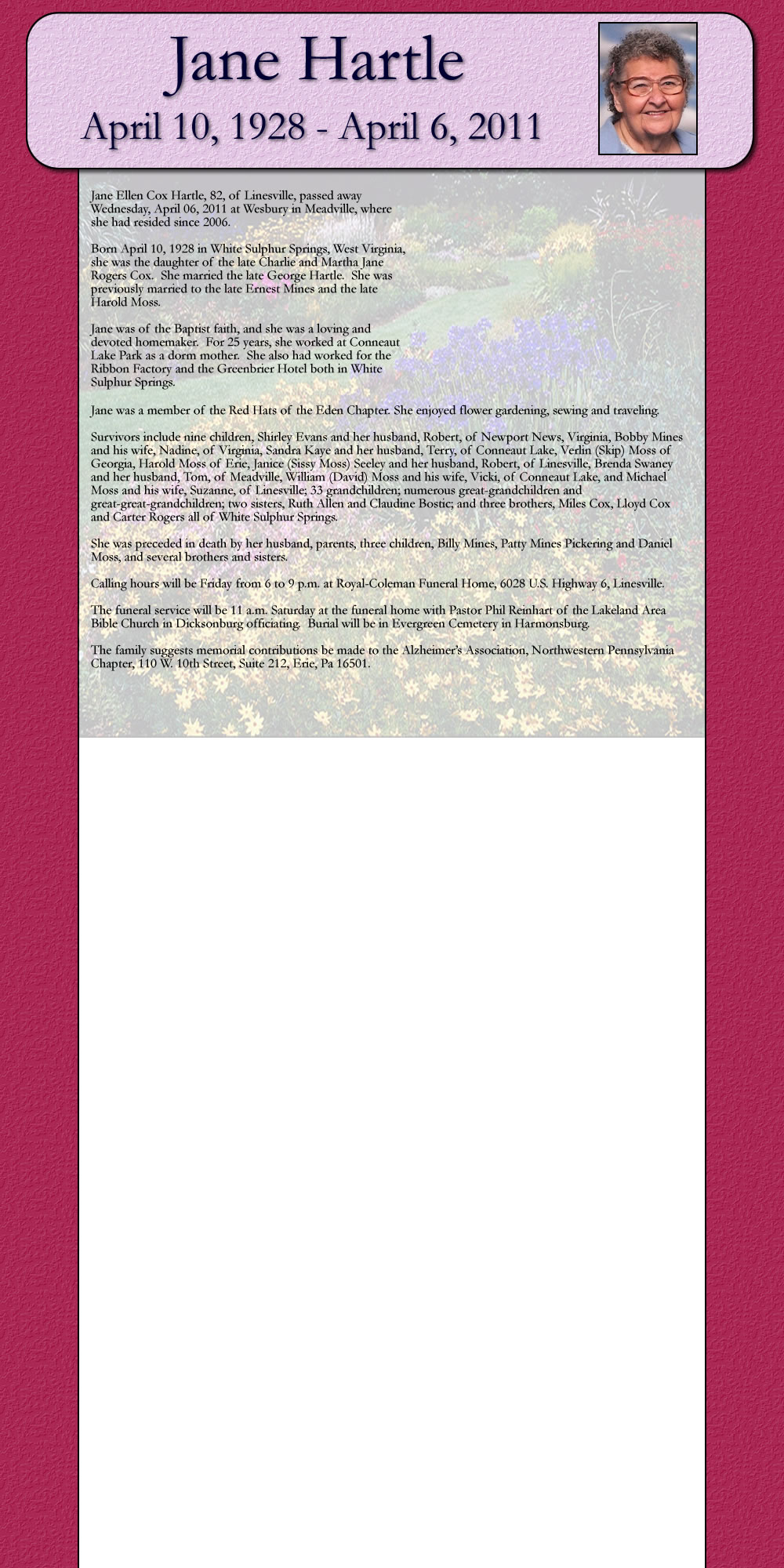 Born Apsil 10, 1928 in White Sulphur Springs, West Virginia, she was the daughter of the late Charlie and Mastha Jane Rogers Cox. She married the late George Hartle. She was previously married to the late Exnest Mines and the late Harold Moss.