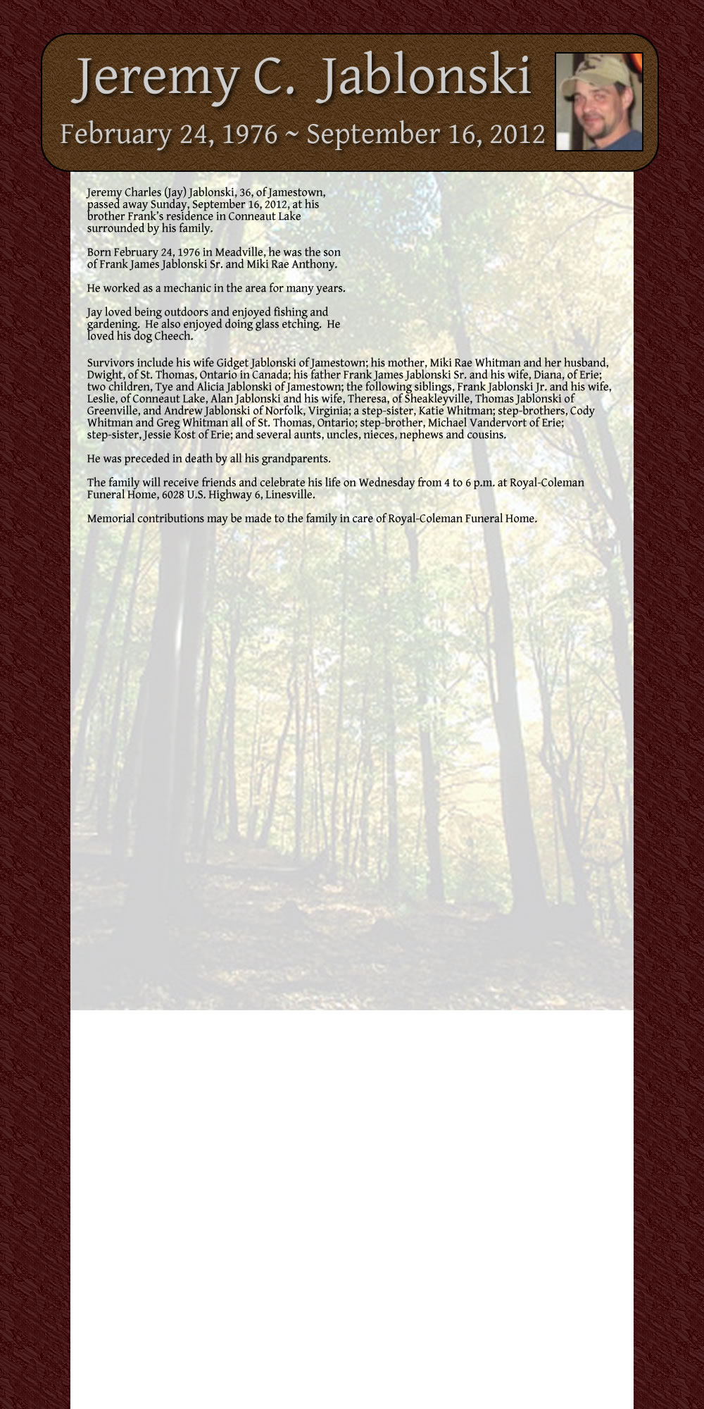 Jeremy Charles (Jay) Jablonski, 36, of Jamestown, assed away Sunday, September 16, 2012, at his other Frank’s residence in Conneaut Lake