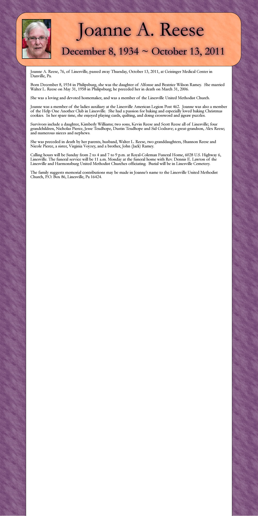 ‘The family suggests memorial contributions may be made in Joanne’s name to the Linesville United Methodist Church, PO. Box 86, Linesville, Pa 16424.