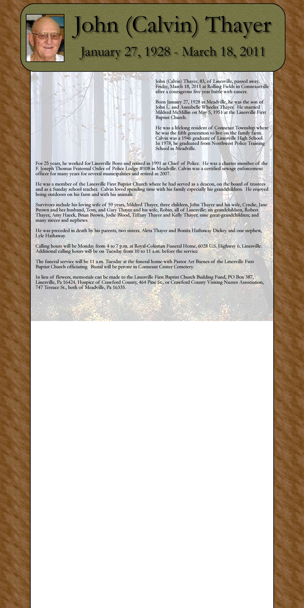 John (Calvin) Thayer, 83, of Linesville, passed away, Friday, March 18, 2011 at Rolling Fields in Conneauwille after a courageous five year battle with cancer.