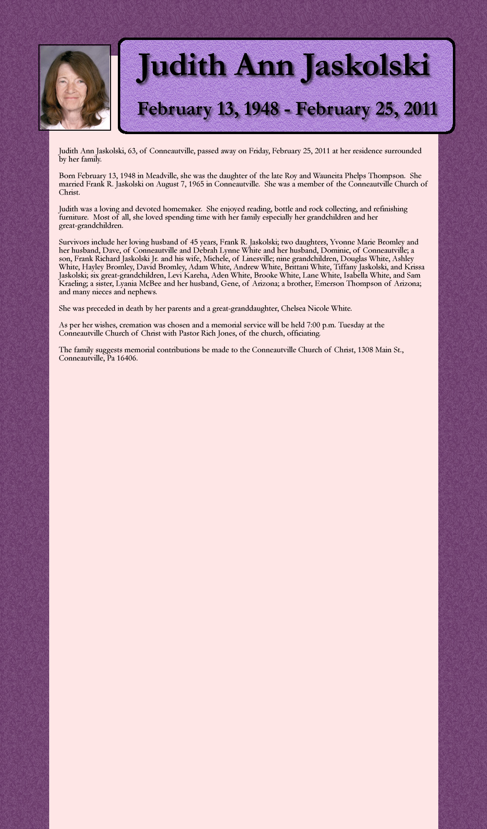 Born February 13, 1948 in Meadville, she was the daughter of the late Roy and Wauneita Phelps Thompson. She married Frank R. Jaskolski on August 7, 1965 in Conneautville. She was a member of the Conneautville Church of Chsist.
