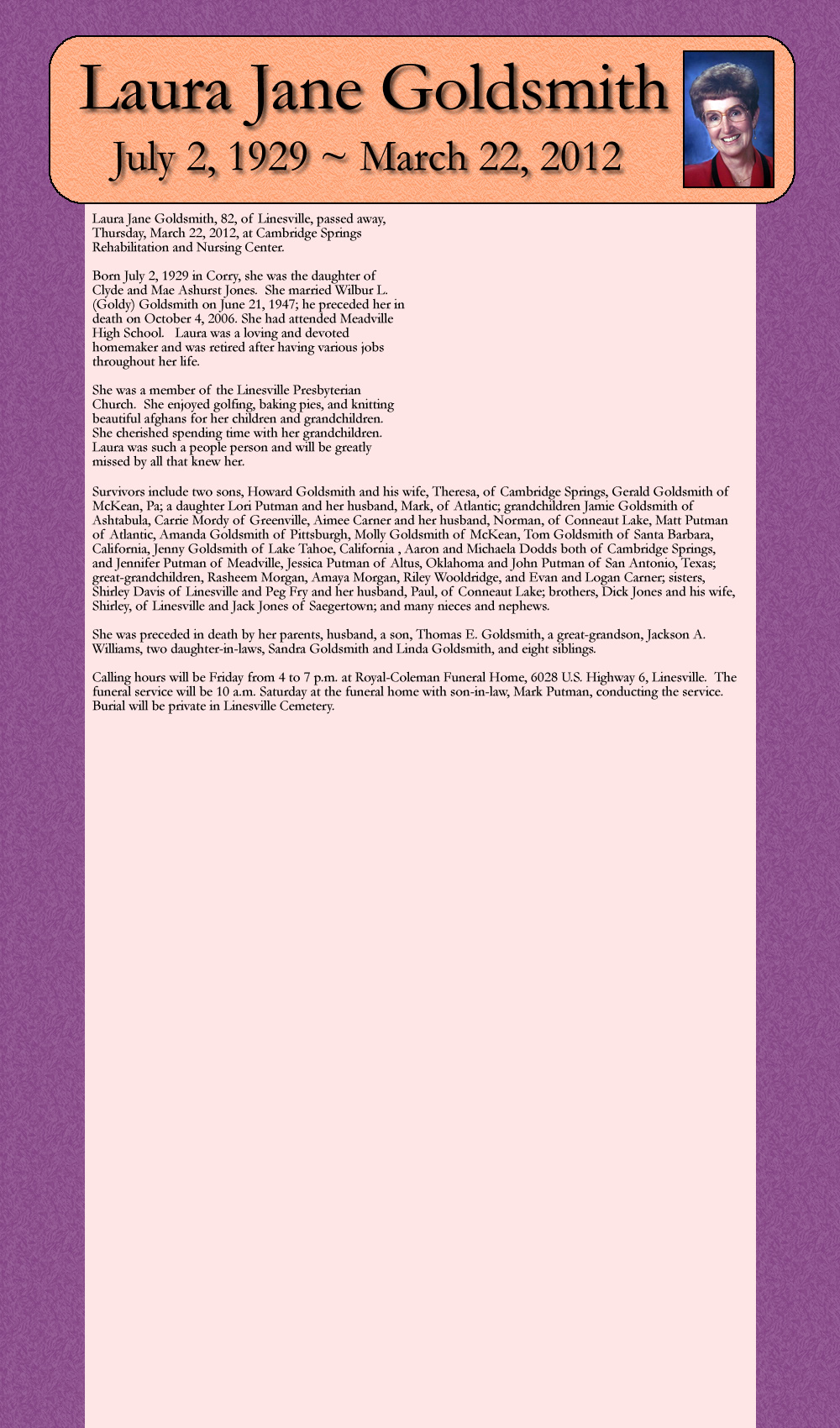 Laura Jane Goldsmith, 82, of Linesville, passed away, Thursday, March 22, 2012, at Cambridge Springs Rehabilitation and Nursing Center.