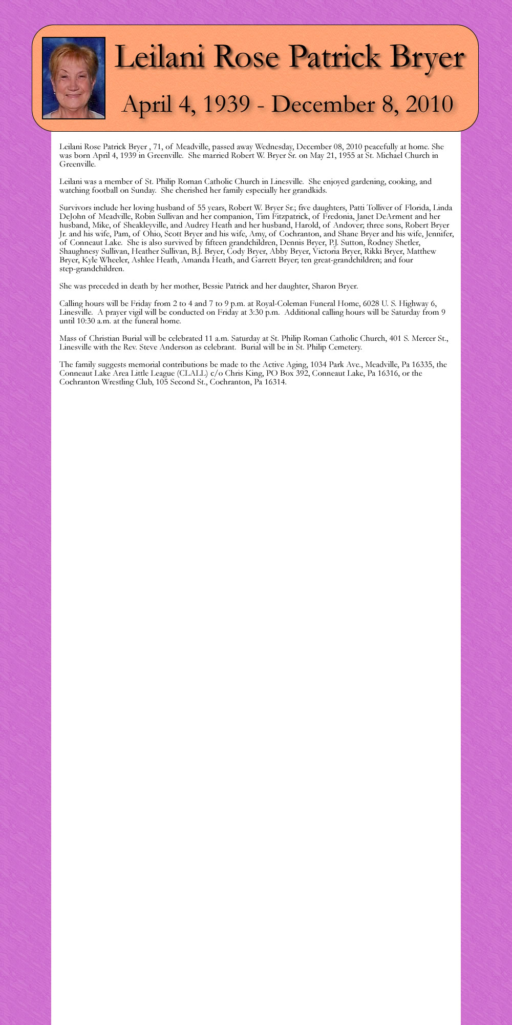 Leilani Rose Patrick Bryer , 71, of Me was born April 4, 1939 in Greenville. § Greenville,