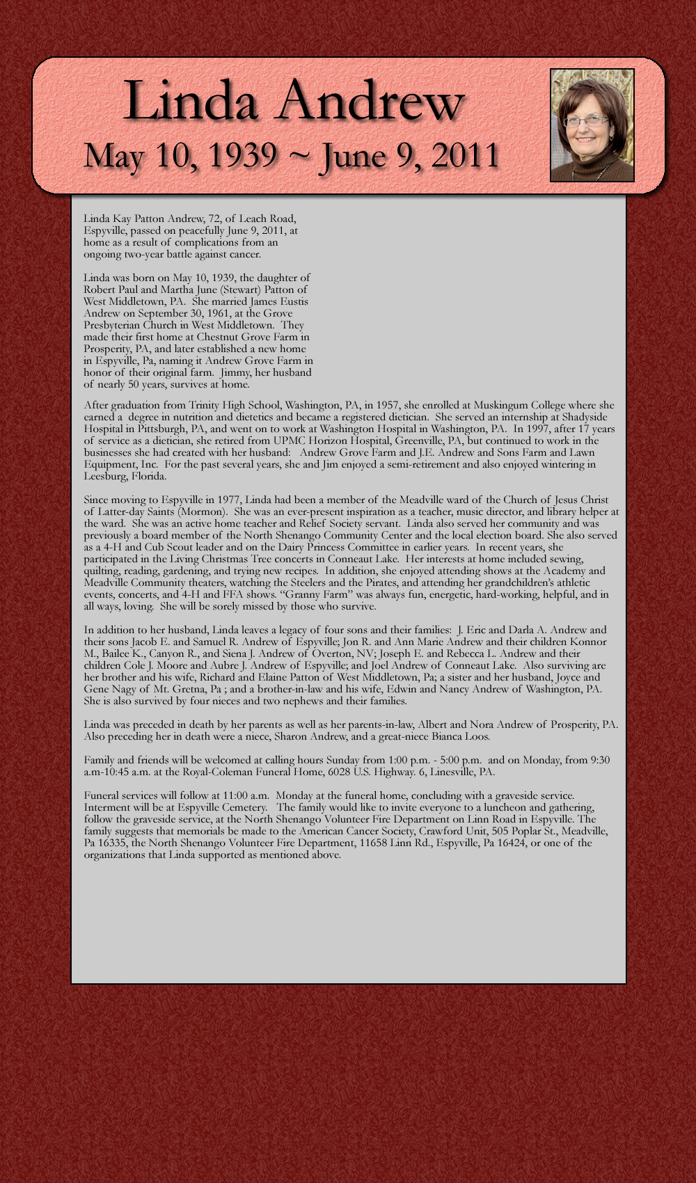 In addition to her husband, Linda leaves a legacy of four sons and their families: J. Eric and Darla A. Andrew and their sons Jacob Hi, and Samuel R. Andrew of E'spyville; Jon R. and Ann Marie Andrew and their children Konnor M., Bailee K., Canyon R., and Siena J. Andrew of Overton, NV; Joseph E. and Rebecca L. Andrew and their children Cole J. Moore and Aubre J. Andrew of Espyville; and Joel Andrew of Conneaut Lake. Also surviving are her brother and his wife, Richard and Elaine Patton of West Middletown, Pa; a sister and her husband, Joyce and Gene Nagy of Mt. Gretna, Pa ; and a brother-in-law and his wife, Edwin and Nancy Andrew of Washington, PA. She is also survived by four nieces and two nephews and their families