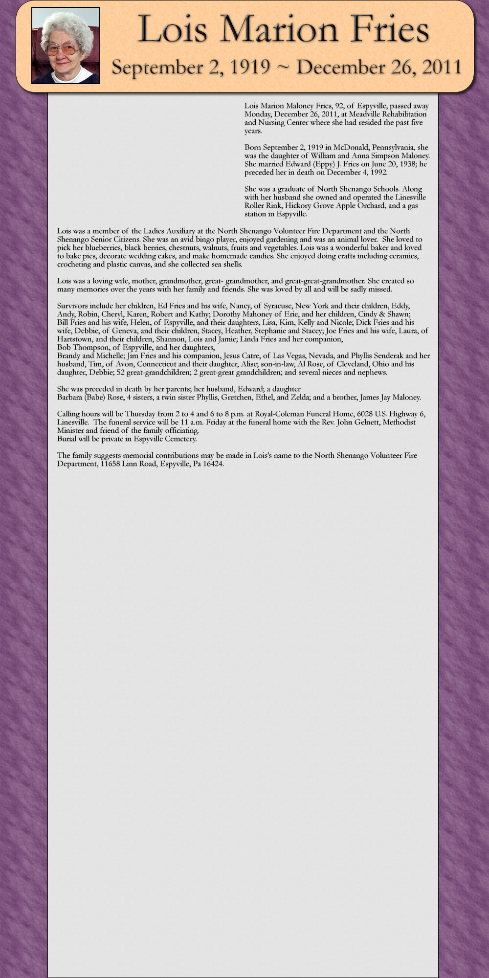 Lois Marion Maloney Fries, 92, of Espyville, passed away Monday, December 26, 2011, at Meadville Rehabilitation and Nursing Center where she had resided the past five years.