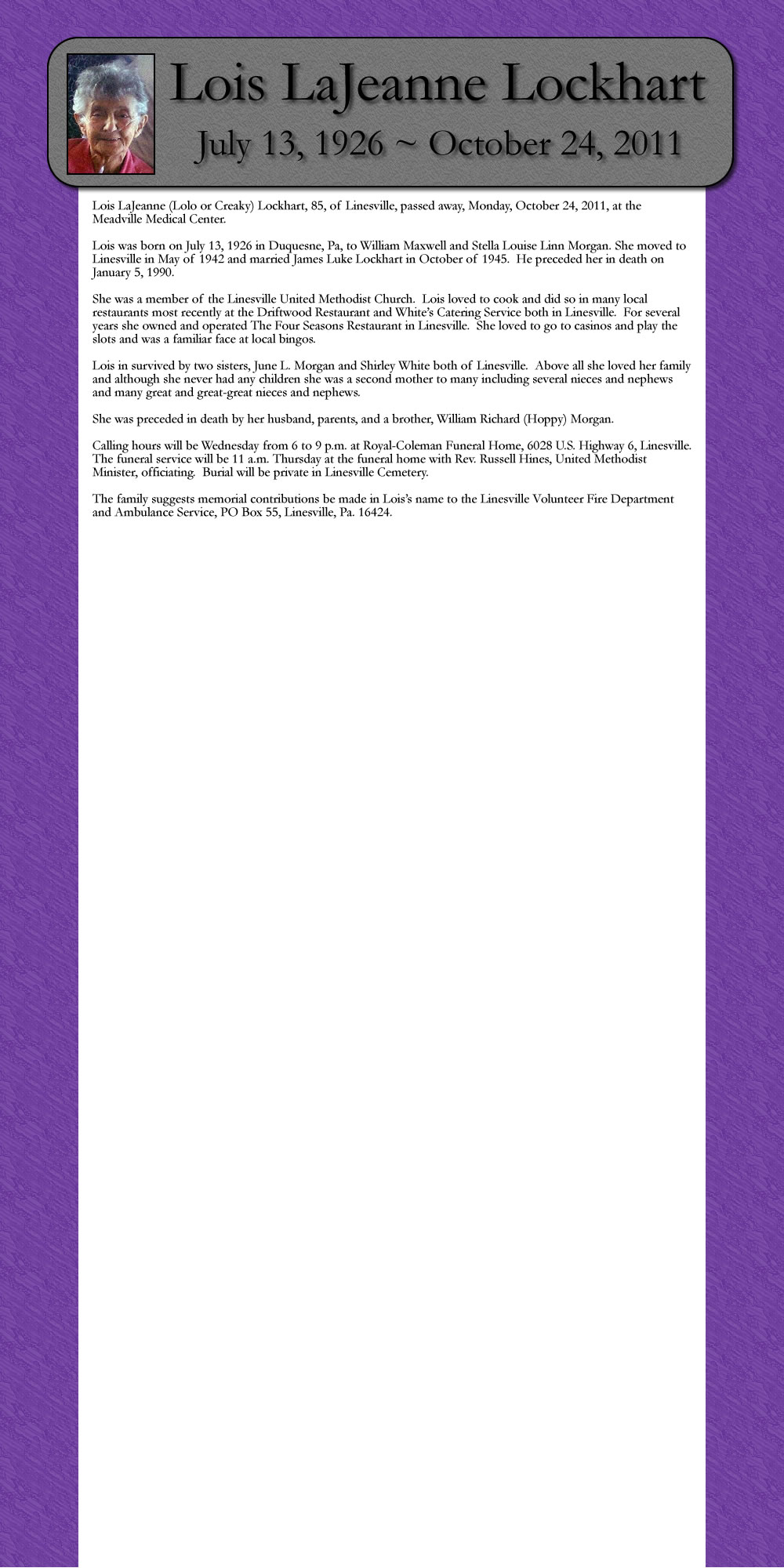 Lois was born on July 13, 1926 in Duquesne, Pa, to William Maxwell and Stella Louise Linn Morgan. She moved to Linesville in May of 1942 and married James Luke Lockhart in October of 1945. He preceded her in death on January 5, 1990.
