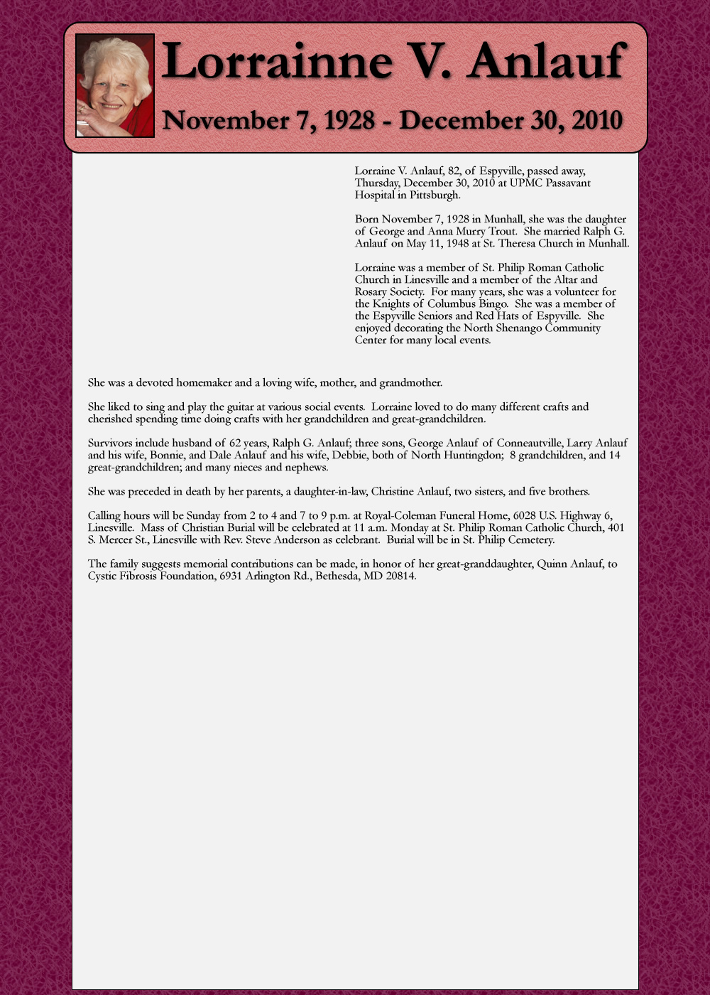‘The family suggests memorial contributions can be made, in honor of her great-granddaughter, Quinn Anlauf, to Cystic Fibrosis Foundation, 6931 Arlington Rd., Bethesda, MD 20814.