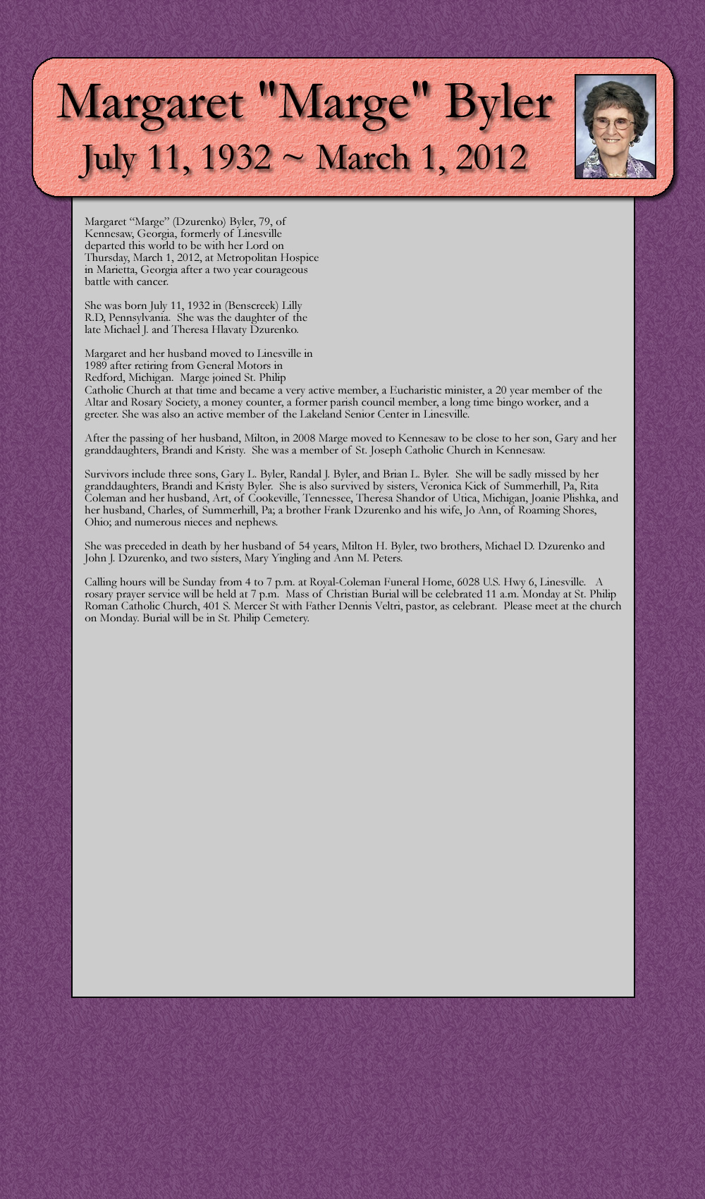 Margaret “Marge” (Dzurenko) Byler, 79, of Kennesaw, Georgia, formerly of Linesville departed this world to be with her Lord on ‘Thursday, March 1, 2012, at Metropolitan Hospice in Marietta, Georgia after a two year courageous battle with cancer.