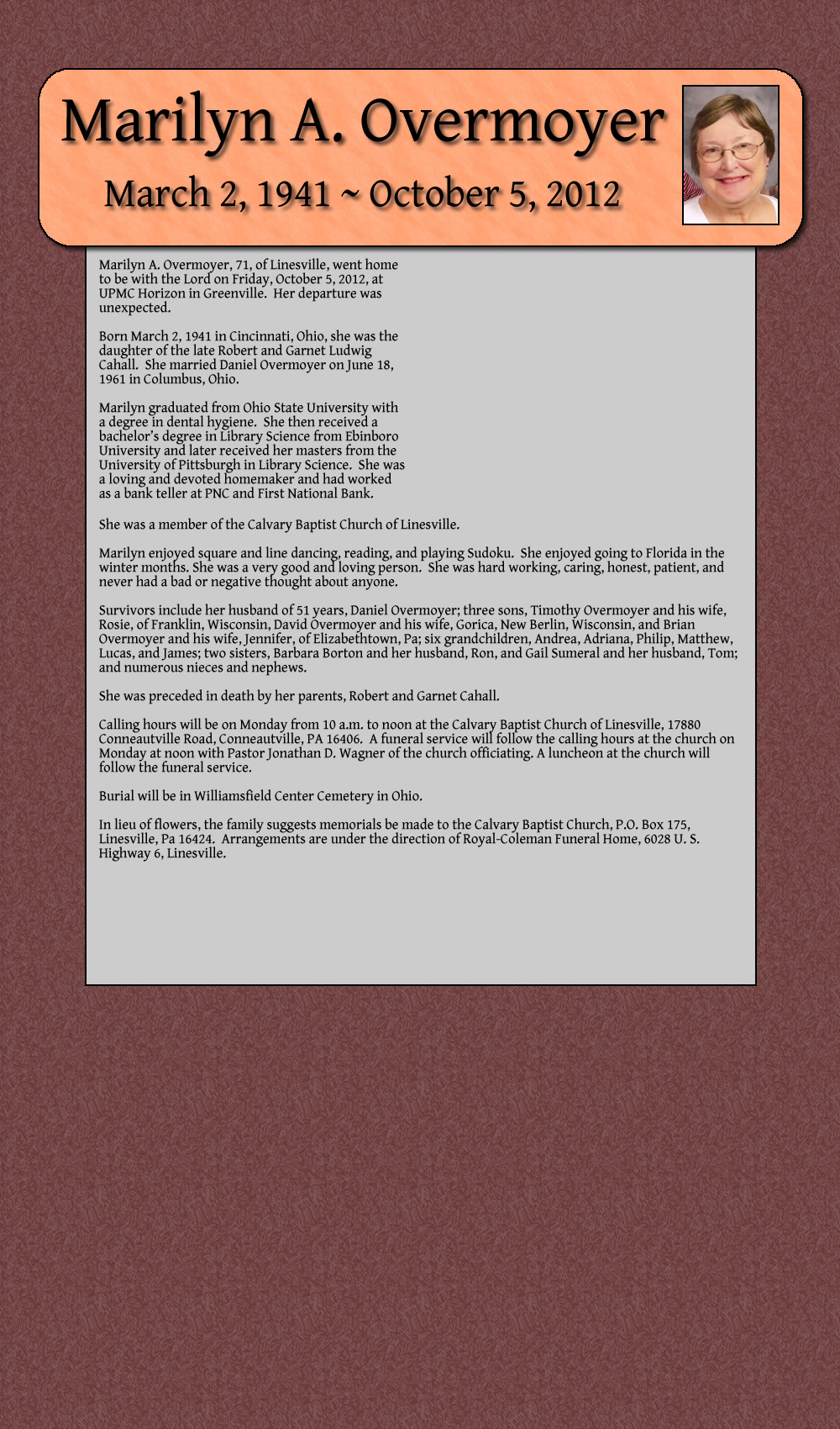 Marilyn A. Overmoyer, 71, of Linesville, went home to be with the Lord on Friday, October 5, 2012, at UPMC Horizon in Greenville. Her departure was unexpected,
