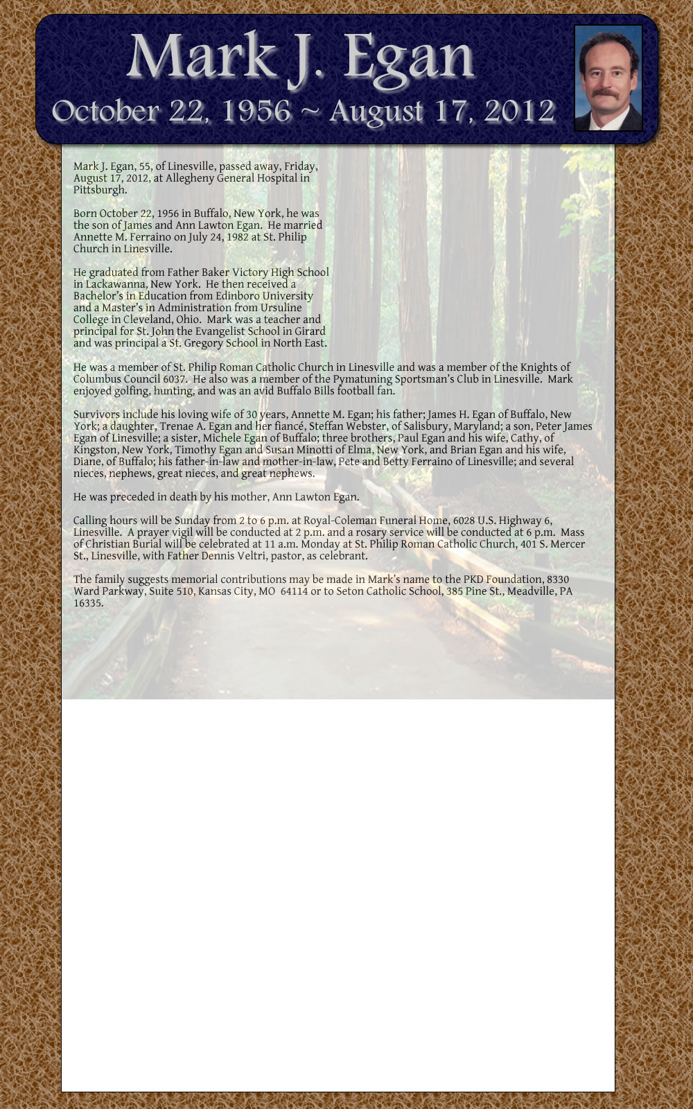 Born October 22, 1956 in Buffalo, New York, he was the son of James and Ann Lawton Egan. He married Annette M. Ferraino on July 24, 1982 at St. Philip Church in Linesville.