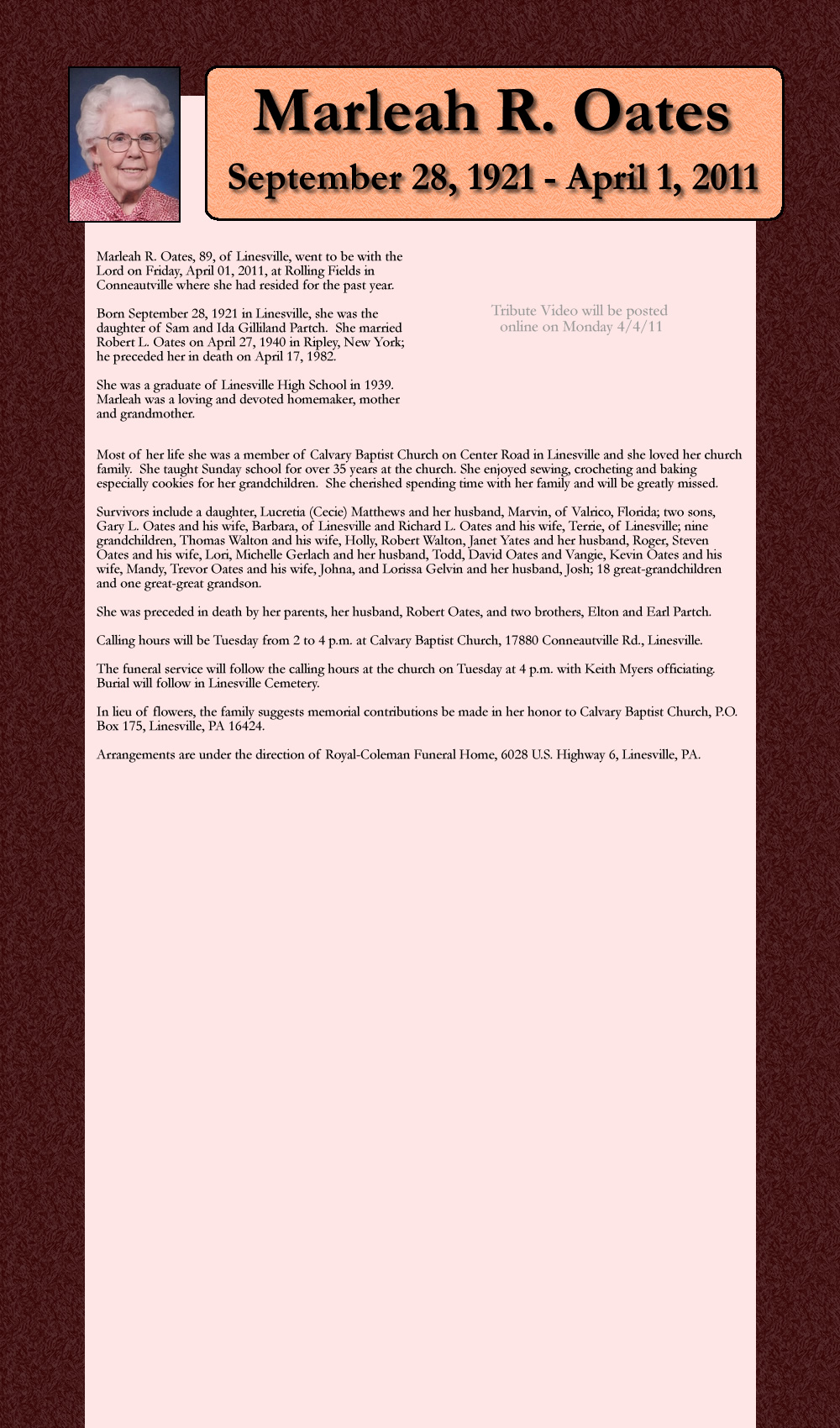 Marleah R. Oates, 89, of Linesville, went to be with the Lord on Friday, April 01, 2011, at Rolling Fields in Conneautville where she had resided for the past year.