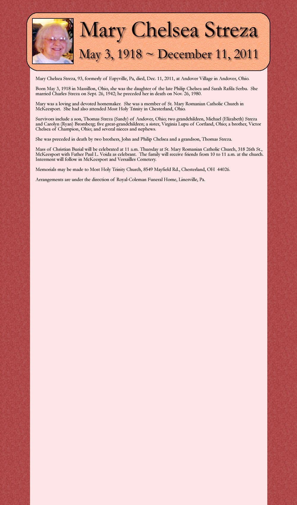 Mary Chelsea Streza, 93, formerly of Espyville, Pa, died, Dec. 11, 2011, at Andover Village in Andover, Ohio.