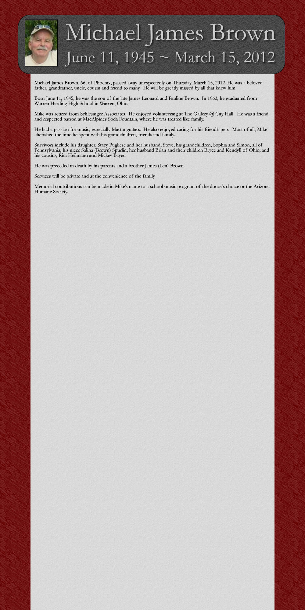 Michael James Brown, 66, of Phoenix, passed away unexpectedly on ‘Thursday, March 15, 2012. He was a beloved father, grandfather, uncle, cousin and friend to many. He will be greatly missed by all that knew him.
