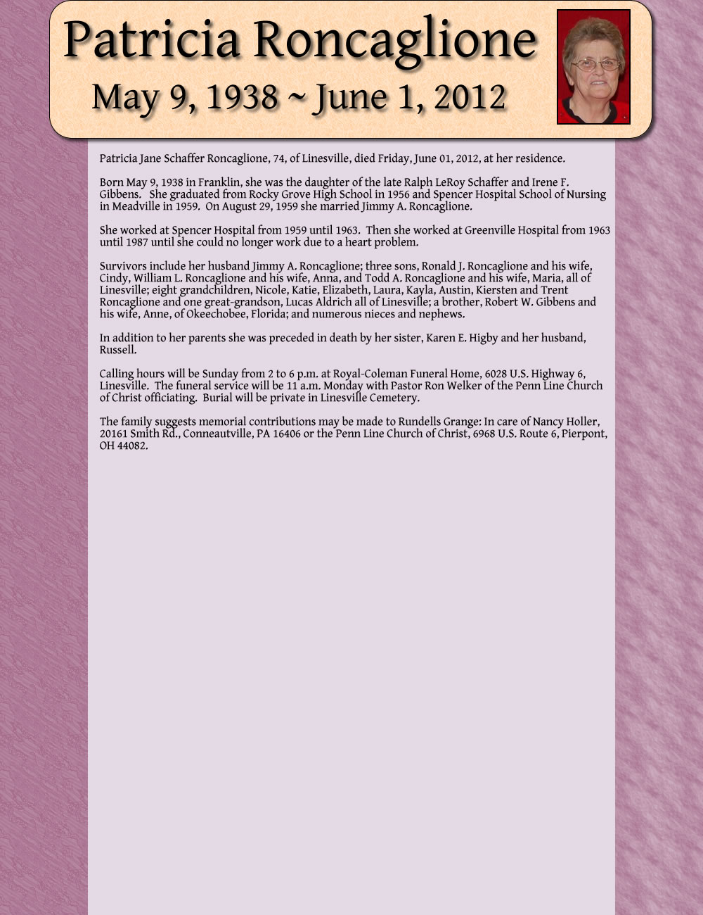 Born May 9, 1938 in Franklin, she was the daughter of the late Ralph LeRoy Schaffer and Irene F. Gibbens. She graduated from Rocky Grove High School in 1956 and Spencer Hospital School of Nursing. in Meadville in 1959. On August 29, 1959 she married Jimmy A. Roncaglione.
