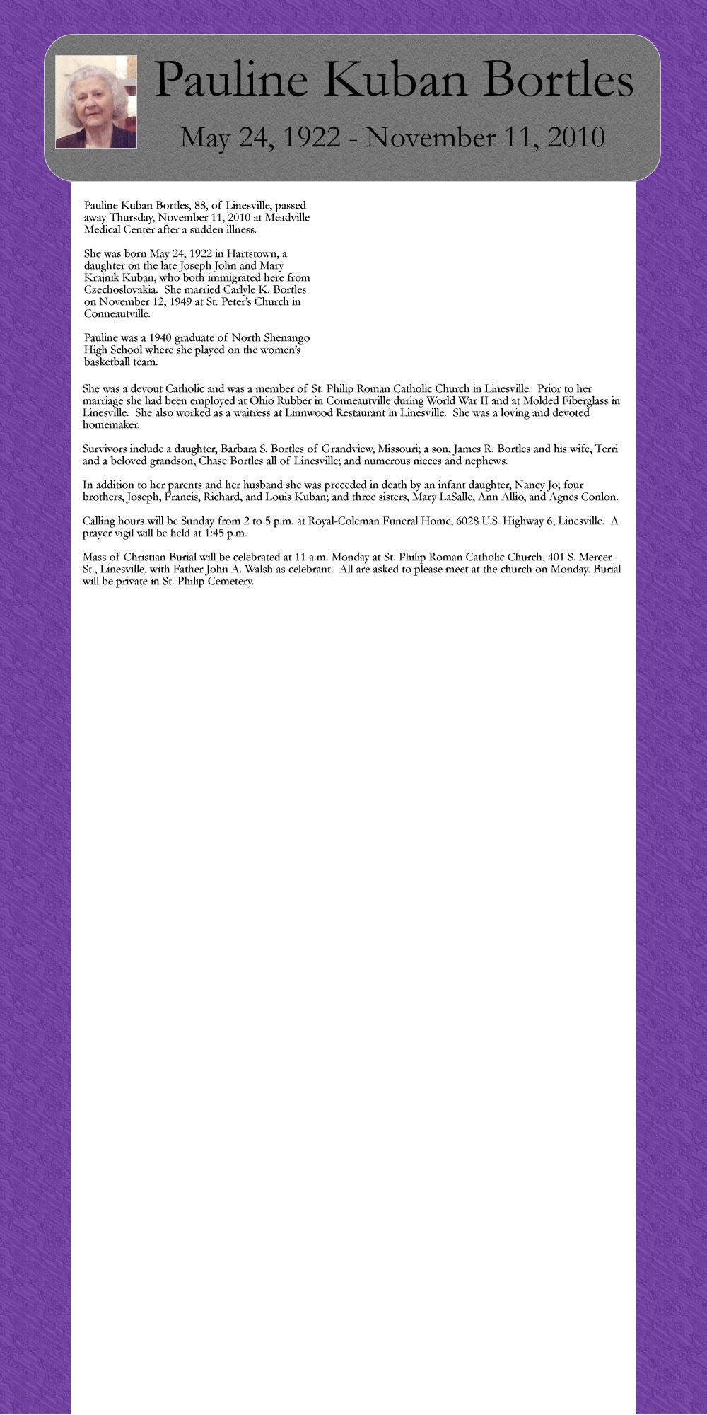 Pauline Kuban Bortles, 88, of Linesville, passed away Thursday, November 11, 2010 at Meadville Medical Center after a sudden illness.