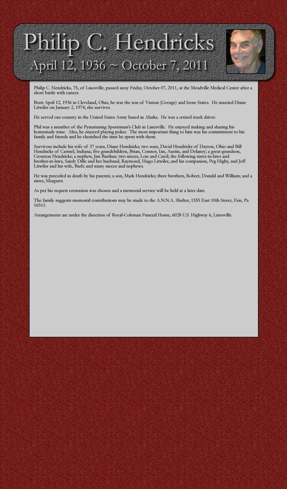Philip C. Hendricks April 12, 1936 ~ October 7, 2011.