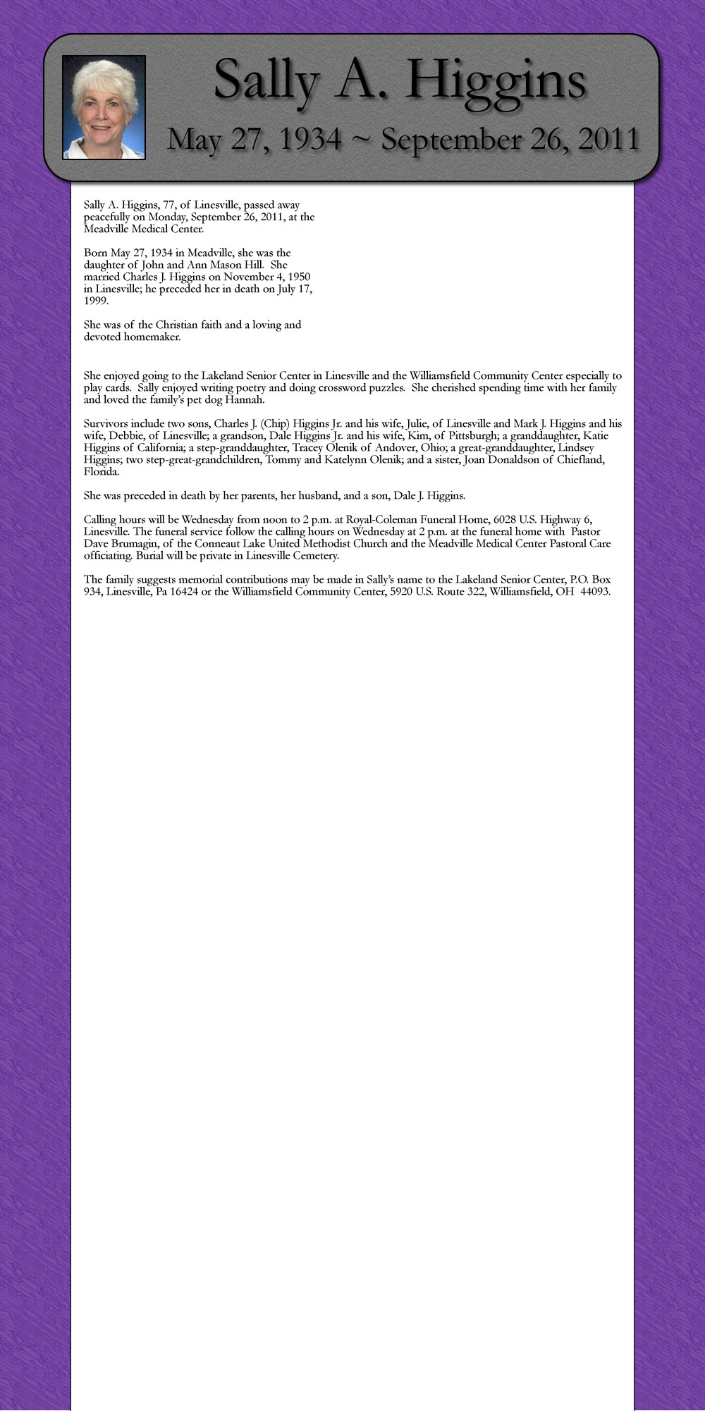 Born May 27, 1934 in Meadville, she was the daughter of John and Ann Mason Hill. She married Charles J. Higgins on November 4, 1950 in Linesville; he preceded her in death on July 17, 1999,