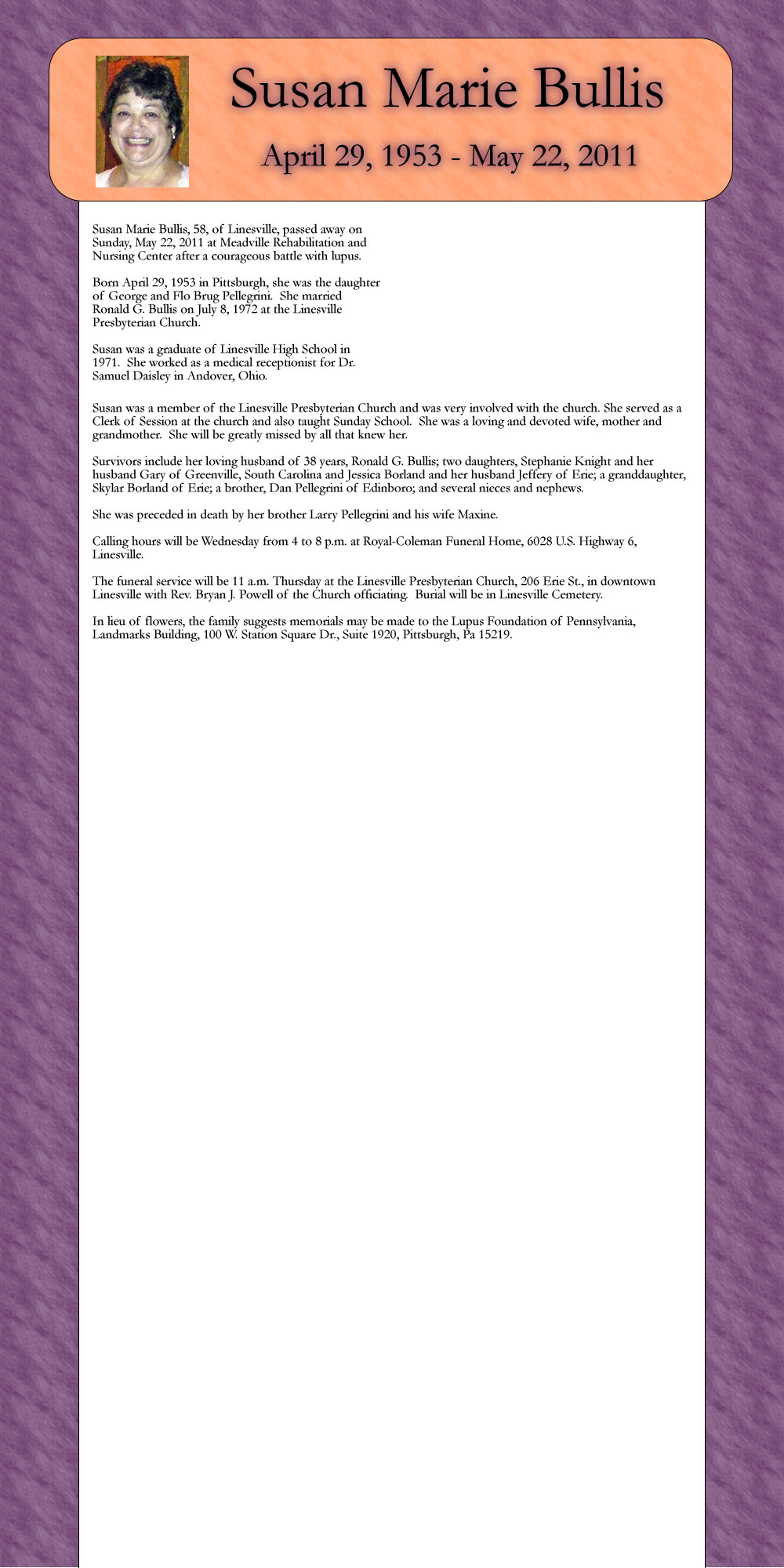 Susan Marie Bullis, 58, of Linesville, passed away on Sunday, May 22, 2011 at Meadville Rehabilitation and Nussing Center after a courageous battle with lupus.
