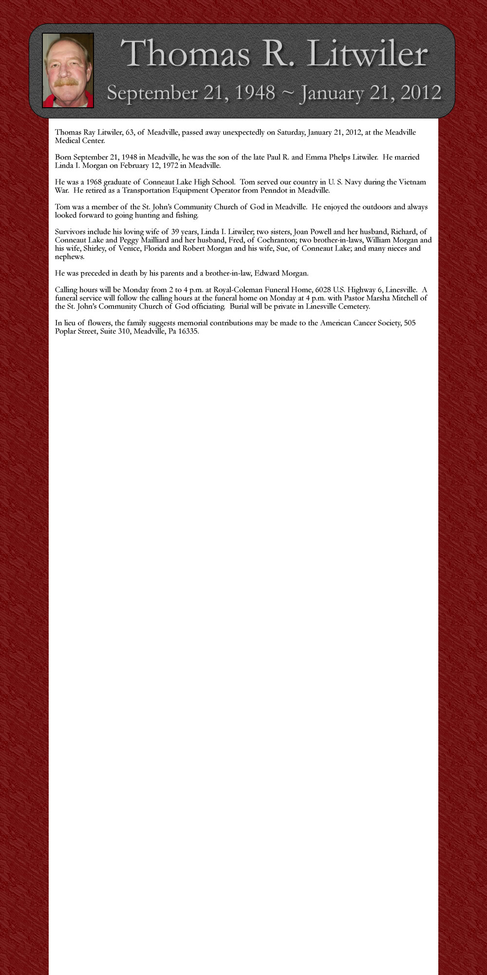 ‘Thomas Ray Litwiler, 63, of Meadville, passed away unexpectedly on Saturday, January 21, 2012, at the Meadville Medical Center,