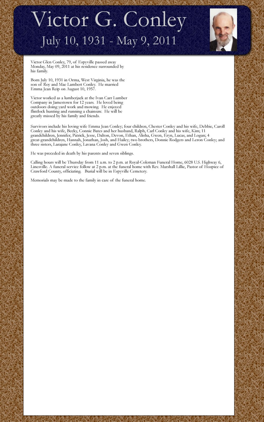 Victor Glen Conley, 79, of E: Monday, May 09, 3011 at his re: his family.