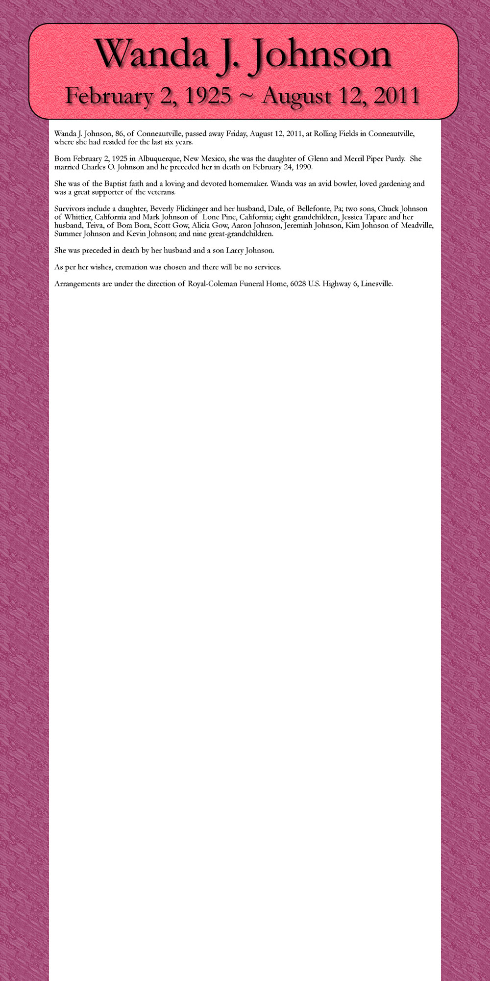 Wanda J. Johnson, 86, of Conneauwville, passed away Friday, August 12, 2011, at Rolling Fields in Conneautville, where she had resided for the last six years.