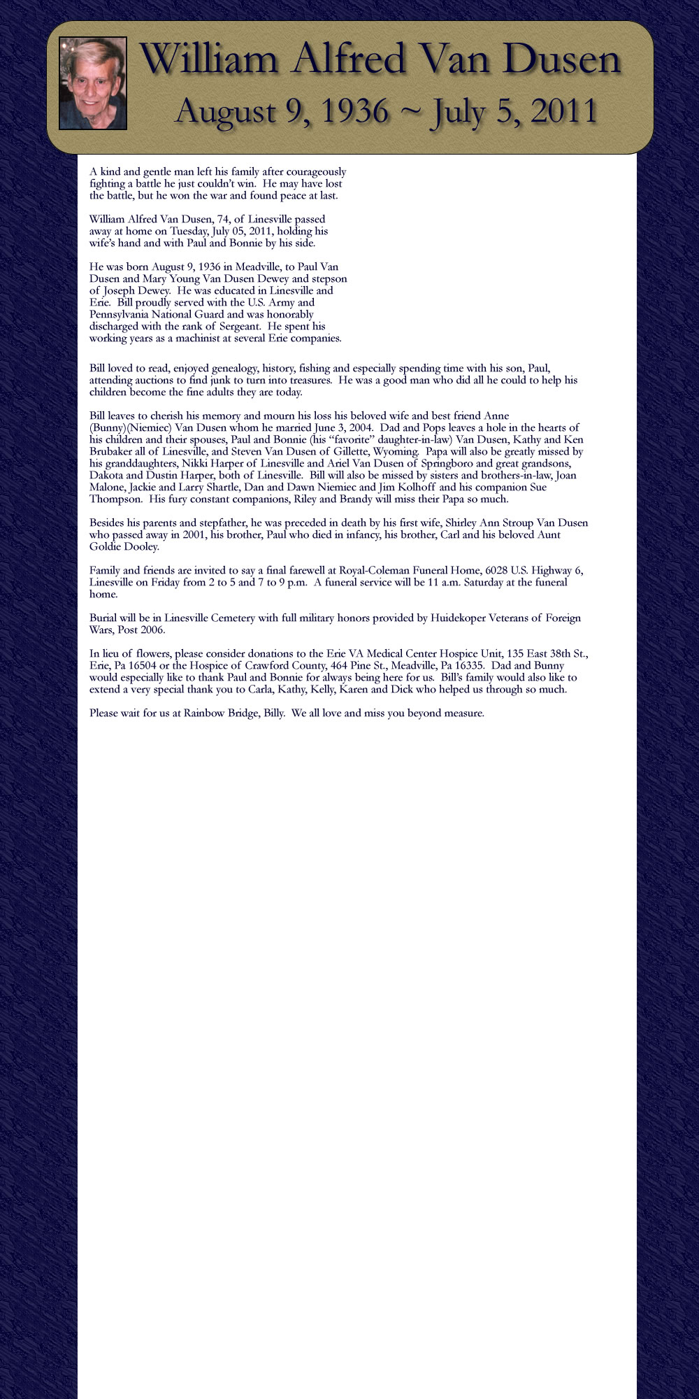 William Alfred Van Dusen, 74, of Linesville passed away at home on Tuesday, July 05, 2011, holding his wife’s hand and with Paul and Bonnie by his side.