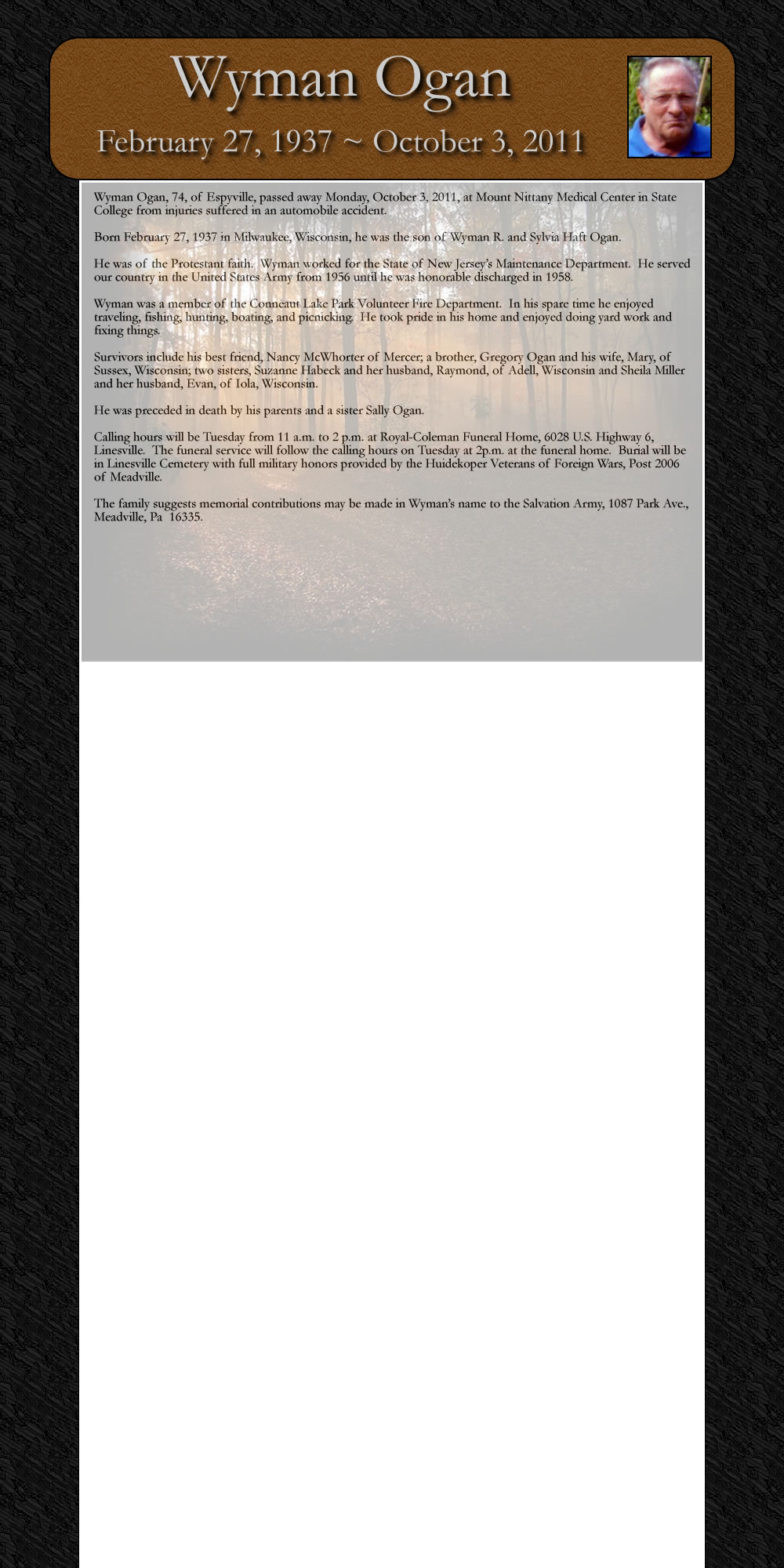 ‘The family suggests memorial contributions may be made in Wyman’s name to the Salvation Army, 1087 Park Ave., Meadville, Pa 16335.
